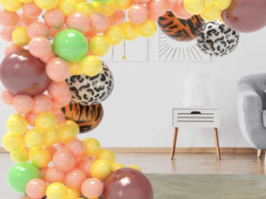 - Leopard Balloons Kit Includes – 4 pcs/22“ aluminum balloons, 6 pcs/18“ balloons, 12 pcs/12“ balloons, 40 pcs/10“ balloons, 100 pcs/5“ balloons, 1 pcs Balloon chain, 1 pcs knotter, 1 pcs ribbon, 100 pcs glue dots. Contains 6 balloons of different colors.