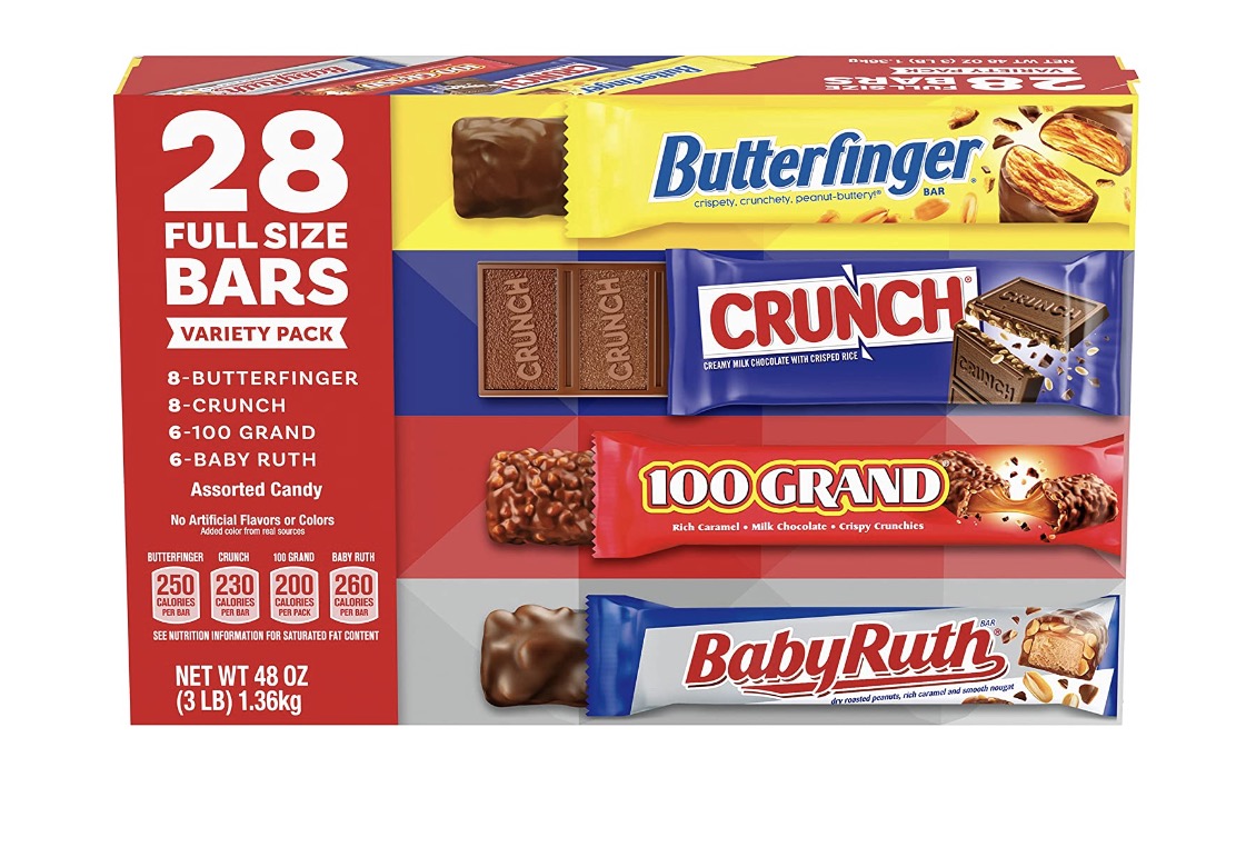 • FULL SIZE FAVORITES: Enjoy the tasty variety of classic favorites like Butterfinger, CRUNCH, Baby Ruth and 100 Grand, available in a 28-count box of individually wrapped Full Size assorted candy bars