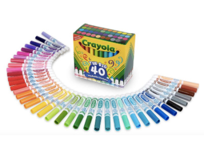 • CRAYOLA BROAD LINE MARKERS: Features 40 Crayola Ultra Clean Washable Markers in assorted colors.
