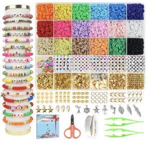 - about 4600 pcs flat polymer clay beads and 500 pcs charms kit( contains 285 pcs letter beads, number beads, spacer beads, clay beads charms, lobster clasp, etc.),1 rolls of stretchy strings, a scissors, 2 plastic tweezers