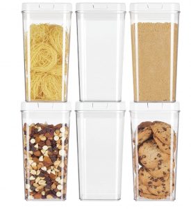 - These storage container bins are ideal for storing dry foods such as flour, sugar, rice, grain, cereals, nuts, beans, snacks, pasta, coffee, and tea