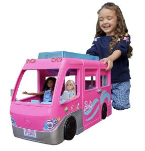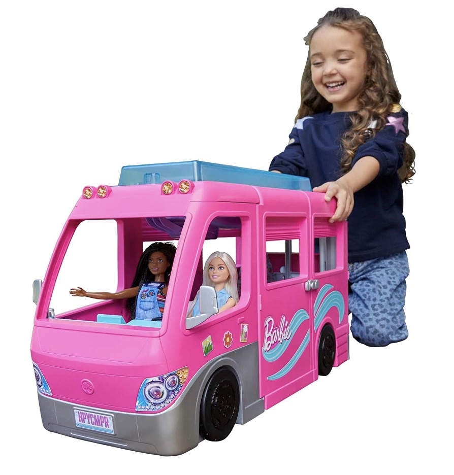 - Hit the road to adventure with the Barbie Dream Camper featuring an epic slide, 7 play areas and everything imaginations need to play out the ultimate camping trip!