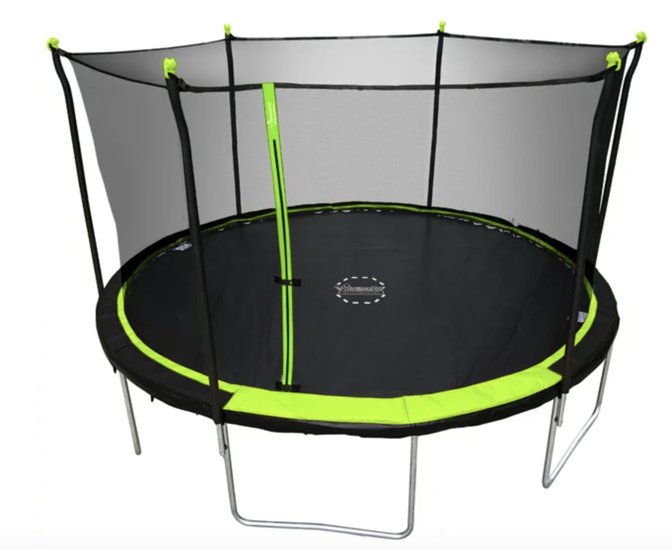 The Bounce Pro 14ft trampoline with enclosure system is a great addition to any backyard. The frame is made of high quality galvanized steel tubes to provide durabiity and stability. The jump mat, spring pad protector and safety enclosure netting are UV resistant and are tested to over double the ASTM standards.
