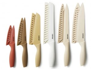 - VALUE ESSENTIAL COLLECTION: The colorful knife set includes all the most common kitchen knives, equips you with a full assortment of all-purpose kitchen cutlery. Include 8″ chef knife, 8″ bread knife, 8″ slicing knife, 7″ santoku knife, 5″ utility knife, 3.5″paring knife, as well as six blade guard.