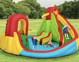 It is brightly colored, with a huge splash pool, two water slides, two climbing walls and a lounger offer sufficient playing space for kids, a water cannon and a built-in basketball rim for extra entertainment.