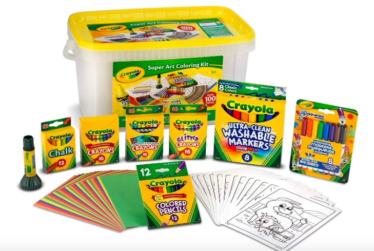 - CRAYOLA ARTS & CRAFTS KIT: Includes Crayons, Glitter Crayons, Construction Paper Crayons, Pipsqueaks Skinnies Markers, Short Colored Pencils, Coloring Pages, Mini Construction Paper Sheets, a Washable Glue Stick, Colored Chalk, Classic Ultra-Clean Broad Line Markers, and Reusable Storage Tub.