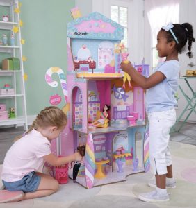 The Candy Castle Wooden Dollhouse by KidKraft will have kids on a sugar rush of imagination. With a rainbow palette across three levels and seven play areas, this magical wooden doll house stands at about four feet tall and is ready to treat dolls and children to a fun-filled day.