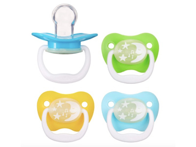 - Includes four Stage 2 glow-in-the-dark pacifiers in assorted colors
