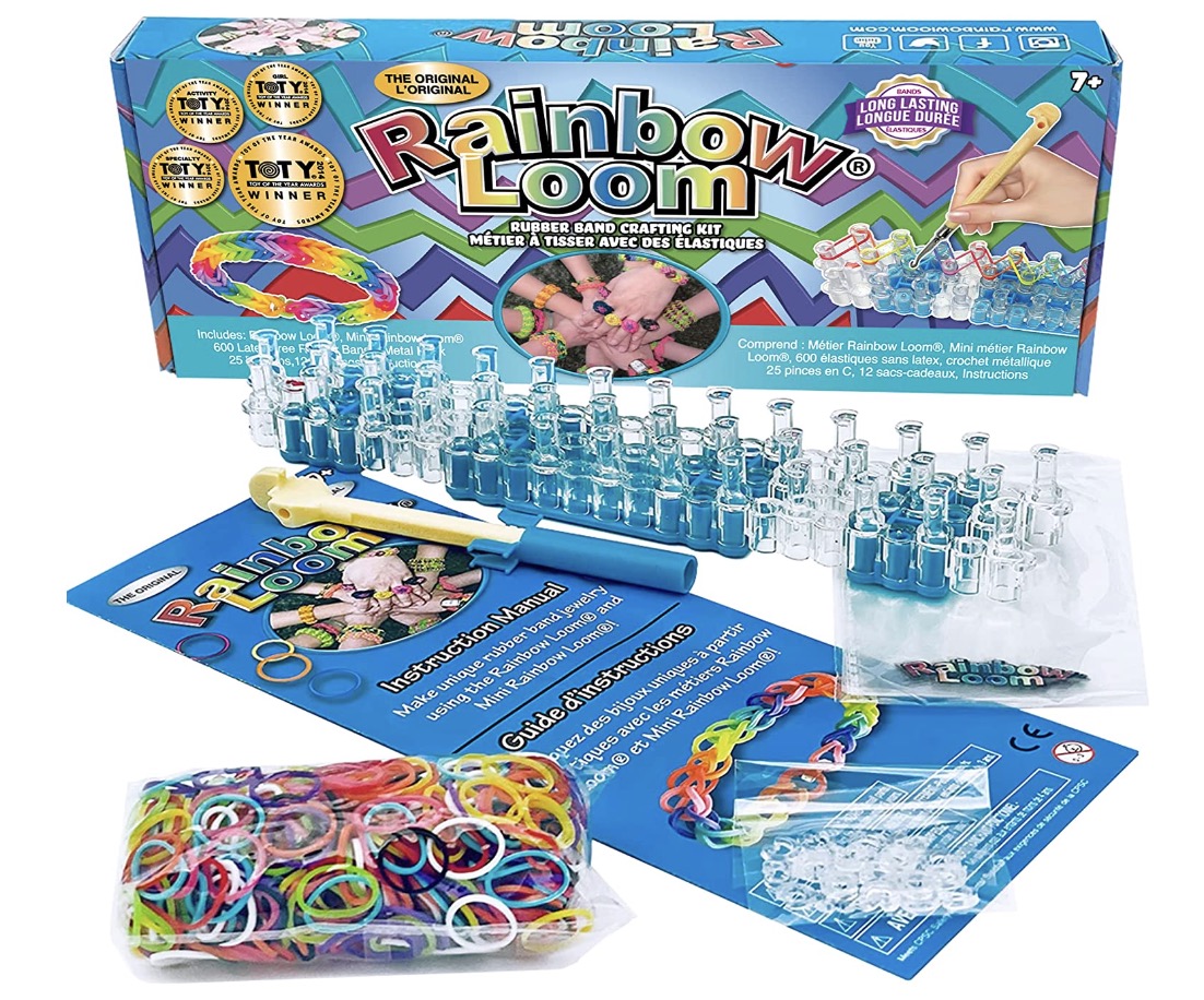 • The Original Rainbow Loom Features, 600 Latex Free Rubber Bands, 25 C-Clips, 1 Metal Hook, 1Rainbow Loom, 1 Mini Loom, 12 Gift Bags, and Instructions.