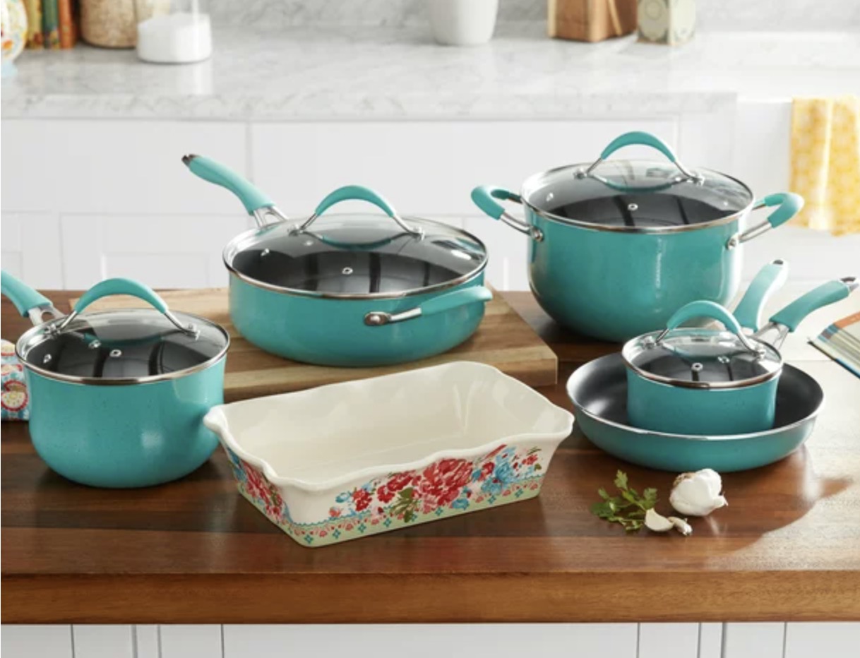 Create tasty meals with The Pioneer Woman frontier speckle turquoise cookware set. The 10-piece set is made from durable aluminum and heats quickly and evenly. This kitchen cookware set includes a non-stick Teflon platinum SR interior for easy food release. The pans also have tempered glass lids for monitoring the cooking process.
