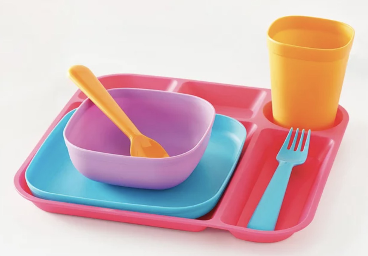- Each mealtime set provides great value and includes the divided plate, plate, bowl, tumbler, spoon and fork. The fork is equipped with blunt tips for safe use. Let us help you make mealtime a bit easier!