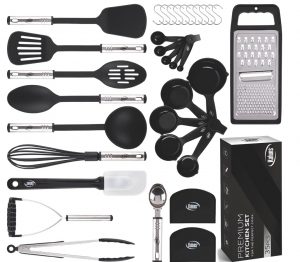 - COOKING UTENSILS SET INCLUDES: Soup Ladle, Solid Spoon, Slotted Spoon, Solid Turner, Slotted Turner, Potato Pusher, Whisk, Grater, Spatula, Tongs, Ice scream Scooper, Measuring Cups, Measuring Spoons, 2 Dough Scrapers, 12 Hanging Hooks And a Beautiful Gift Box.