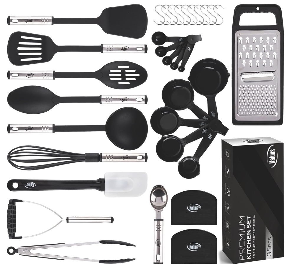 - KALUNS KITCHEN UTENSIL SET: Our utensil sets have everything you need for a perfect cooking experience! Kaluns kitchen gadgets and accessories are made of a combination of nylon and stainless steel to ensure no scratching or sticking.