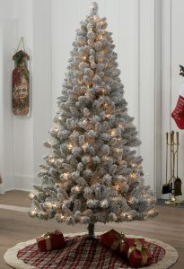 - Holiday Time 6.5-Foot Pre-Lit Flocked Frisco Pine Artificial Christmas Tree 821 branch tips 250 pre-strung clear incandescent lights (102 watts) Comes with a metal tree stand Designed with white-flocked green branches