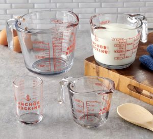 - INCLUDES: This set contains (1) 5-Oz glass measuring cup, (1) 1-cup glass measuring cup, (1) 2-cup glass measuring cup, and (1) 4-cup glass measuring cup. Anchor Hocking’s signature spout facilitates clean pouring to reduce messes and ensure you can be exact in your cooking.
