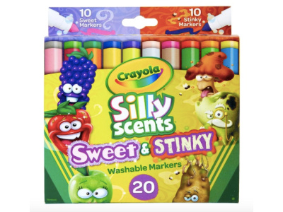 • CRAYOLA SILLY SCENTS MARKERS: Features 10 Sweet-Smelling Markers and 10 Stinky Markers.