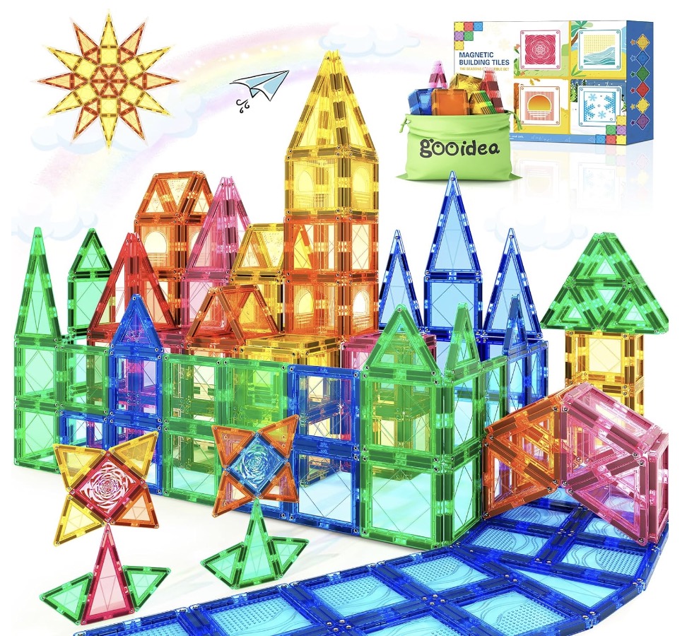 - Magnetic Tiles: Set of 38 colorful, non-toxic magnetic building blocks for creative play and learning